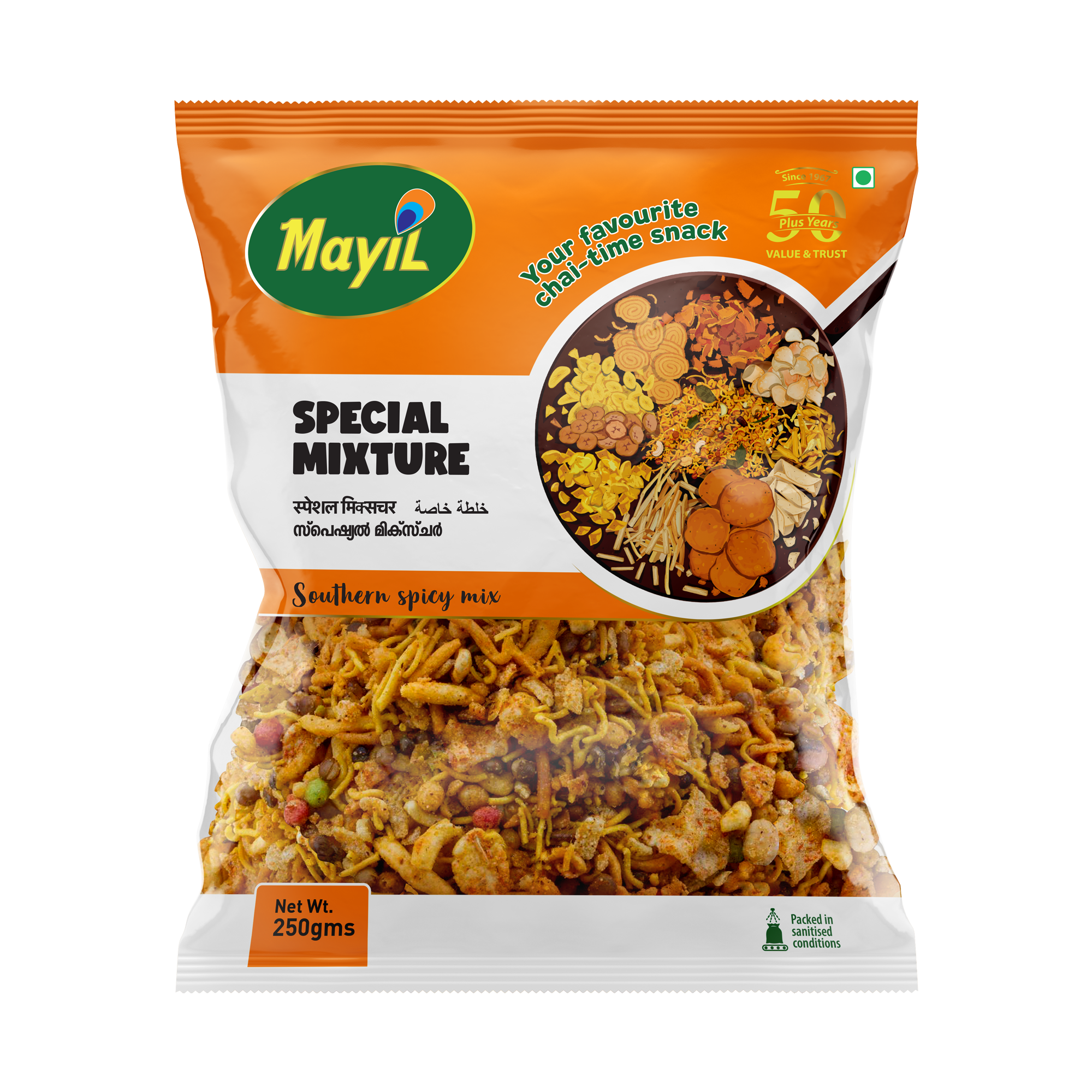 Special mixture is a salty and spicy tea-time snack in which spicy sev is mixed with fried peanuts, roasted split chickpeas, boondi, fried curry leaves and lastly coated with red chili powder and asafoetida. It is an excellent accompaniment with tea / coffee.
